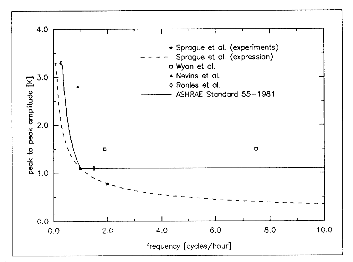 Regardless of these differences all results seem to indicate that with cyclic fluctuating ambient temperatures the bandwidth of acceptable temperatures decreases with increasing fluctuation frequency. This bandwidth seems to be at its maximum in steady-state conditions. This can be seen in Figure 2.2 which comprises the major results of the experiments and indicates which fluctuation frequencies were investigated. The results suggest that there is a certain amplitude threshold (at about 1 K) below which the influence of fluctuation frequency is negligible. At frequencies below approximately 1.5 cycles/hour the maximum acceptable peak to peak amplitude increases with decreasing frequency until the steady-state comfort bandwidth is reached.