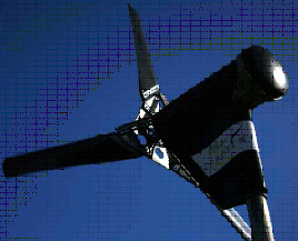 The Proven HAWT is a down wind turbine. It uses cleverly designed plastic blades to extract wind energy. These blades have the ability to bend inwards in strong gusts to protect themselves. This bending also changes the aerodynamic qualities of the blades, and allows the turbine to operate at its rated value even in very high wind speeds. A wind vane is part of the construction and allows the turbine to yaw for rapid changes in direction.