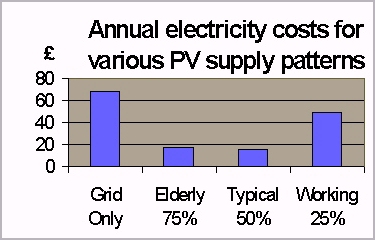 Even in the best case scenario, the annual gain from generated electricity, does not exceed £50. Considering, an annual bill fo only £63 if electricity was bought solely from the grid, the gain is very small to justify the investment. The good point seems to be the small differences between the good (elderly-75%) and the moderate (typical 50%) cases, which suggests a rather good supply of actual demand. We did not take into account though the increase of electricity consumption during winter time.