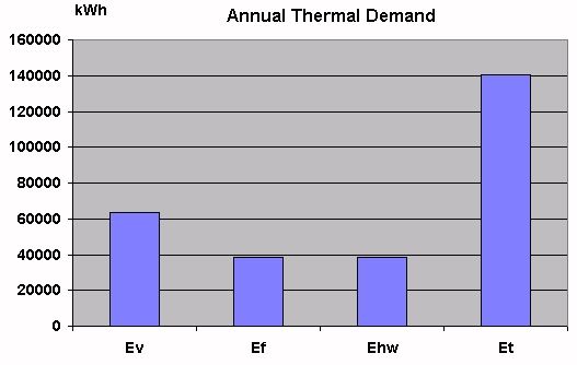 The degree-days method was used to calculate monthly losses. For the fabric losses Ef, we considered separate U values for the fabric elements. As far as the ventilation lossesEv are concerned, a value of N=0.8ACH (the air changes per hour) was used. For the hot water we considered a 50lt/person daily consumption, and estimated the number of residents in each of the 16 flats in the Sustainable development housing scheme. The results are shown below: