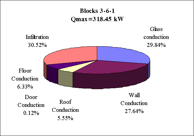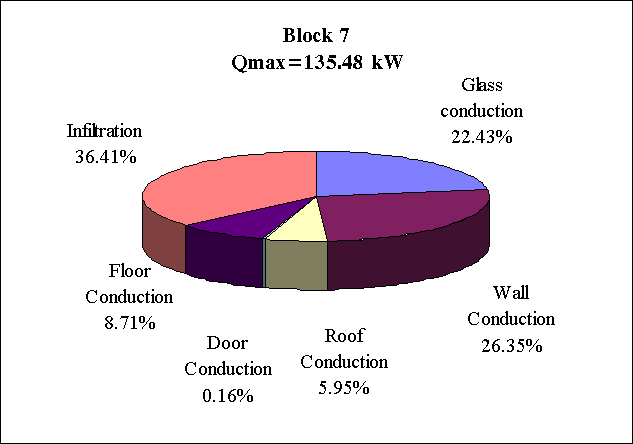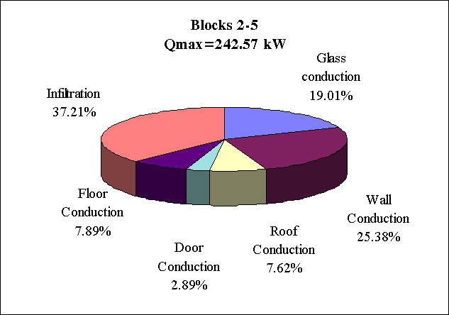 The components of the peak heat losses (Fig. 3.10 , 3.11, 3.12 and 3.13) show an essential share of the infiltration of outdoor air and of the heat transfer through windows and outer walls.