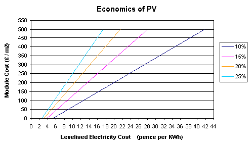 ![]() The four lines in the chart indicate different efficiencies of the PV panels. Depending on the efficiency of the PV panel and the cost of the module, it can be easily calculated the levelised electricity cost in (p/kWh). |
